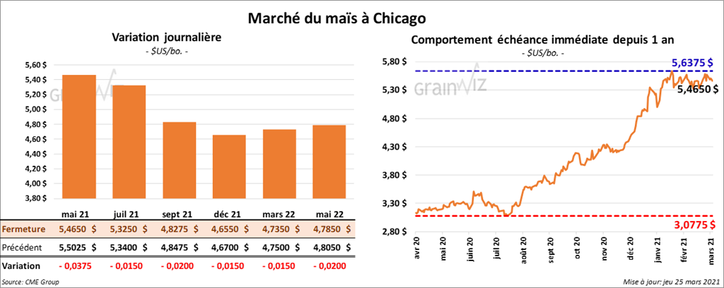 Les contrats de maïs US aux échéances les plus rapprochées ont terminé la journée en baisse entre 1 ½ et 3 ¾ cents.
