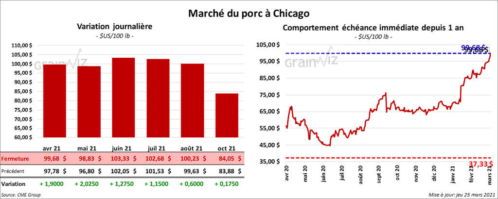 - Le 23 mars dernier, le CME Lean Hog Index était en hausse de 38 cents à 93,85 $.