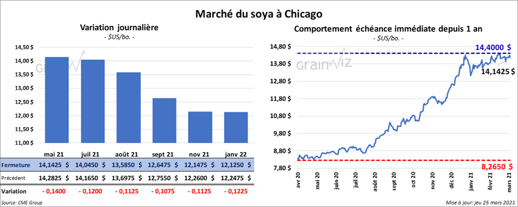 Les contrats de soya US aux échéances les plus rapprochées ont fini la session en baisse entre 10 ¾ et 14 cents. Ceux de tourteau de soya US aux échéances les plus rapprochées ont fait l’inverse en clôturant en hausse entre 1,30 et 3,60 $/tonne. Les contrats d’huile de soya US aux échéances les plus rapprochées ont terminé dans le rouge entre 4,08 % et 4,35 %.