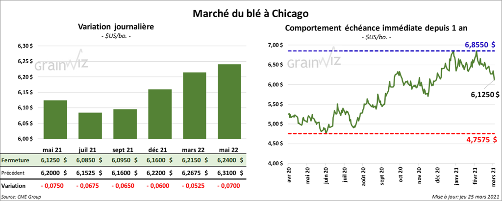 À Chicago, les contrats de blé aux échéances les plus rapprochées ont terminé la séance en baisse entre 6 et 7 ½ cents. À Kansas, les contrats de blé dur rouge aux échéances les plus rapprochées ont clôturé dans le rouge entre 8 ½ et 9 ½ cents. À Minneapolis, ceux de blé de printemps aux échéances les plus rapprochées ont fermé avec des pertes entre 8 et 9 ½ cents.