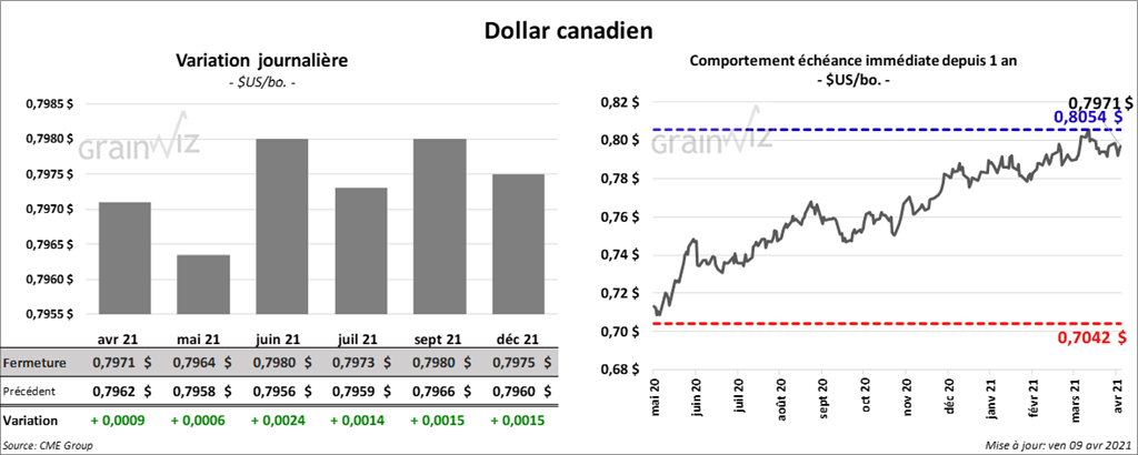- Mondialement, l’USDA a estimé les stocks de fin d’année de soya en baisse de 3,13 millions de tonnes comparativement à mars dernier à 86,87 millions de tonnes. Les analystes prévoyaient des inventaires à 83,52 millions de tonnes. Pour le Brésil, l’USDA a augmenté son évaluation de la production de soya de 2 millions de tonnes à 136 millions de tonnes. Il a laissé inchangée son estimation de celle de soya argentin à 47,50 millions de tonnes.