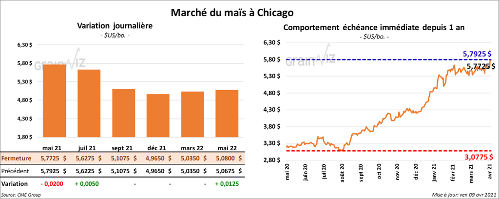 - Ce midi, l’USDA présentait son rapport sur l’offre et la demande pour le mois d’avril. Il estime que les inventaires de fin d’année de l’ancienne récolte de maïs US sont de 1,352 milliard boisseaux, soit une baisse de 150 millions de boisseaux par rapport à mars dernier. En avril 2019/20, les stocks avaient été évalués à 1,919 milliard de boisseaux. Les anticipations de marché étaient plus élevées à 1,396 milliard de boisseaux.