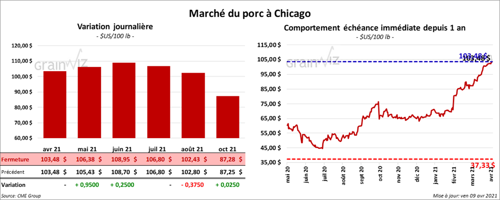 - Le 7 avril dernier, le CME Lean Hog Index était en hausse de 47 cents à 100,94 $.
