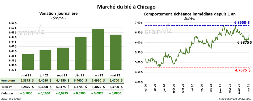 À Chicago, les contrats de blé aux échéances les plus rapprochées ont terminé la journée avec des gains entre 9 et 10 ½ cents. À Kansas, ceux de blé dur rouge ont fini la session en hausse entre 10 et 10 ½ cents. À Minneapolis, les contrats de blé de printemps aux échéances les plus rapprochées ont fermé dans le vert entre 12 et 13 ¾ cents.