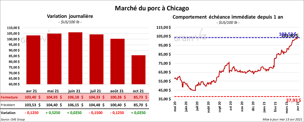 - Le 9 avril dernier, le CME Lean Hog Index était en hausse de 52 cents à 101,89 $.