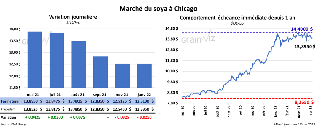 Les contrats de soya US aux échéances les plus rapprochées ont terminé la journée entre une baisse de 3 ¼ cents et une augmentation de 4 ¼ cents. Ceux de tourteau de soya US aux échéances les plus rapprochées ont fermé en baisse entre 4,30 et 6,90 $/tonne. Les contrats d’huile de soya US ont fini la session avec des gains entre 2,88 % et 3,17 %.