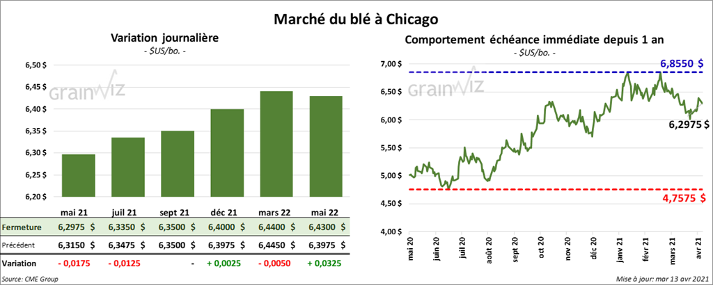 À Chicago, les contrats de blé aux échéances les plus rapprochées ont fini la journée quelque part entre une baisse de 1 ¾ et une hausse de ¼ cents. À Kansas, les contrats de blé dur rouge aux échéances les plus rapprochées ont clôturé avec des gains entre 5 ½ et 6 cents. À Minneapolis, ceux de blé de printemps aux échéances les plus rapprochées ont également fermé dans le vert entre 4 ¾ et 6 ¼ cents.