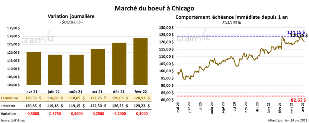 - Le 16 avril dernier, le CME Feeder Cattle Index était en baisse de 1,55 $ à 140,13 $.