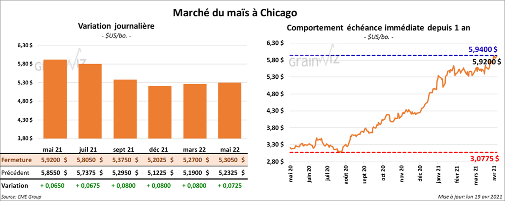 Les contrats de maïs US aux échéances les plus rapprochées ont fini la séance en hausse entre 6 ½ et 8 cents.