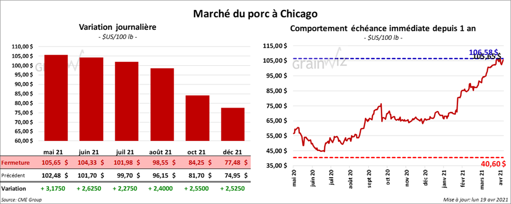 - Le 15 avril dernier, le CME Lean Hog Index était en hausse de 21 cents à 103,24 $.