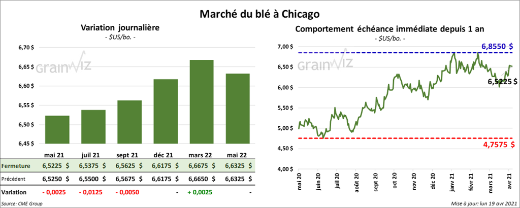 À Chicago, les contrats de blé aux échéances les plus rapprochées ont fermé entre le neutre et une baisse de 1 ¼ cent. À Kansas, les contrats de blé dur rouge aux échéances les plus rapprochées ont terminé la journée en hausse entre 2 ¼ et 2 ¾ cents. À Minneapolis, les contrats de blé de printemps aux échéances les plus rapprochées ont fini quelque part entre une baisse de ½ cent et une hausse de ¼ cent.