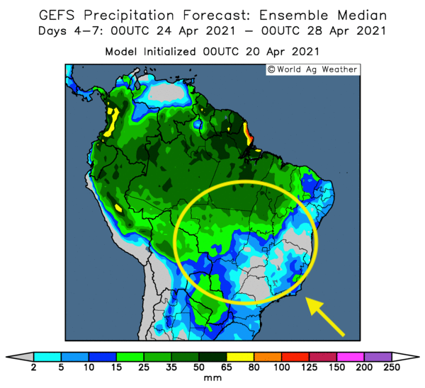 Cette carte montre les probabilités d'averses pour le centre et le sud du Brésil au cours des 4 à 7 prochains jours