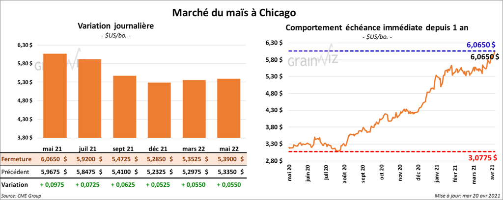 Les contrats de maïs US aux échéances les plus rapprochées ont terminé la journée en hausse entre 5 ¼ et 9 ¾ cents.