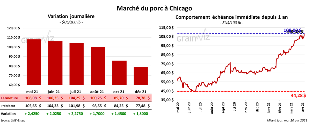 - Le 16 avril dernier, le CME Lean Hog Index était en hausse de 52 cents à 103,76 $.