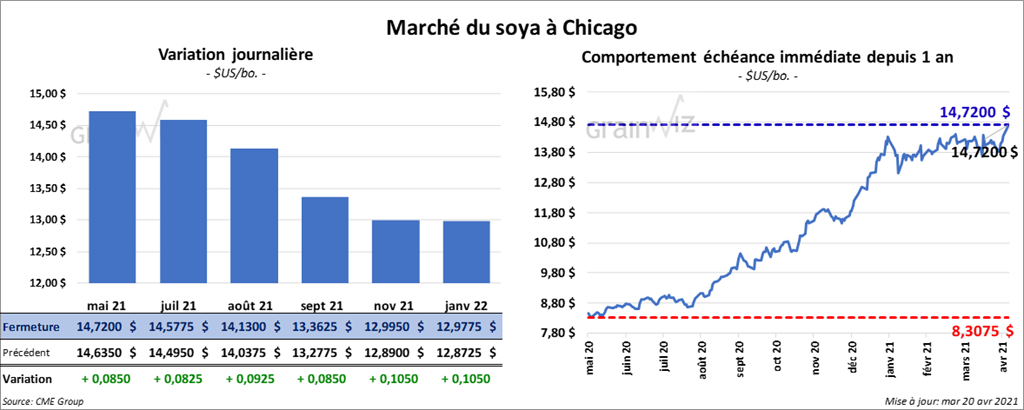 Les contrats de soya US aux échéances les plus rapprochées ont fini la journée en hausse entre 8 ¼ et 10 ½ cents. Ceux de tourteau de soya US aux échéances les plus rapprochées ont également clôturé dans le vert entre 2,90 et 4,10 $/tonne. Les contrats d’huile de soya US aux échéances les plus rapprochées fermé avec des gains entre 1,67 % et 3,64 %.