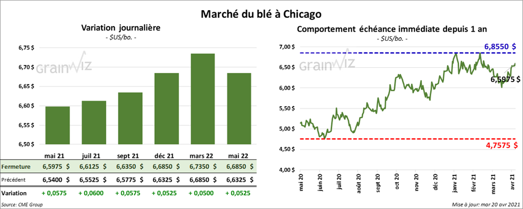 À Chicago, les contrats de blé US aux échéances les plus rapprochées ont terminé la session en hausse entre 5 ¼ et 6 cents. À Kansas, les contrats de blé dur rouge aux échéances les plus rapprochées ont clôturé avec des gains entre 8 ¾ et 9 ¼ cents. À Minneapolis, ceux de blé de printemps ont fermé en progression entre 3 ¾ et 4 ½ cents.