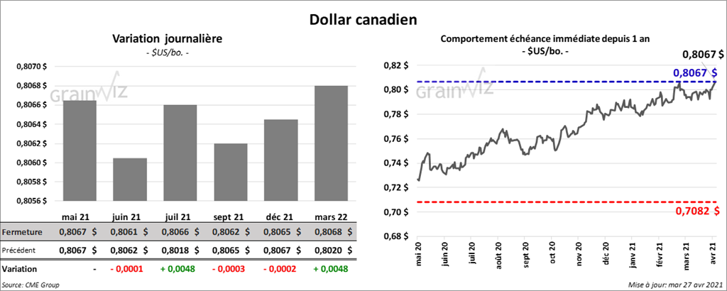 - Pour le rapport sur les superficies des grandes cultures canadiennes, Statistique Canada mentionne que les producteurs canadiens prévoient planter 6,9 % moins de blé en 2021 à une superficie de 23,3 millions d’acres. Les marchés prévoyaient une superficie à 23,7 millions d’acres. Cette baisse devrait affecter surtout le blé de printemps où cette dernière est estimée à 8,8 % pour une superficie de 16,3 millions d’acres. Quant au blé durum, les agriculteurs projettent une légère augmentation de la superficie à 5,7 millions d’acres. Les anticipations des analystes étaient de 5,5 millions d’acres.