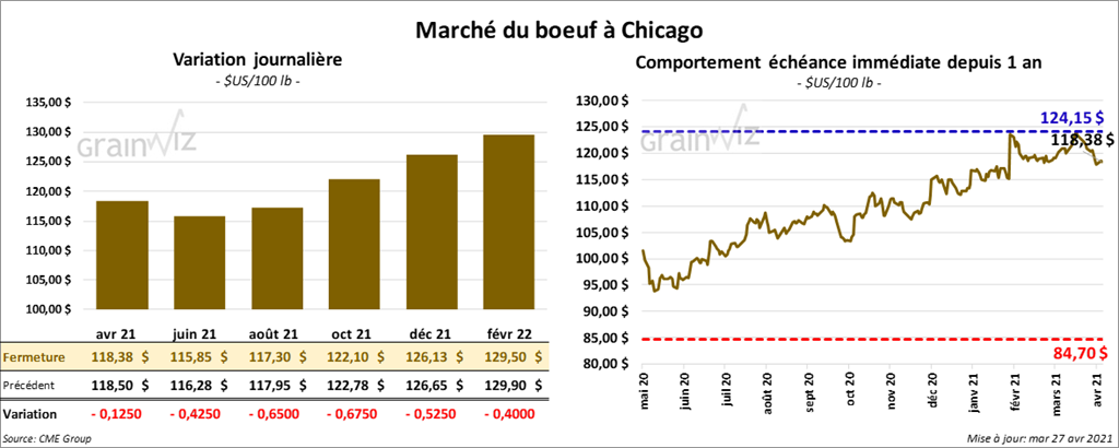 Les contrats de bœuf US aux échéances les plus rapprochées ont fermé avec des pertes entre 12 et 67 cents. Ceux de veau US aux échéances les plus rapprochées ont également clôturé en baisse entre ¾ cent et 1,40 $. Celui avril 21 a fait exception en finissant en hausse de 1,45 $.