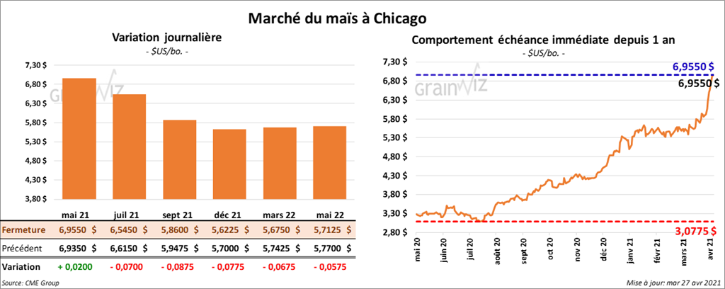 À L’exception de celui mai 21, qui a clôturé en hausse de 2 cents, les contrats de maïs US aux échéances les plus rapprochées ont terminé la session en baisse entre 7 et 8 ¾ cents.