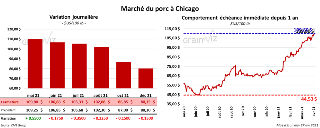 - Le 22 avril dernier, le CME Lean Hog Index était en hausse de 52 cents à 106,51 $.
