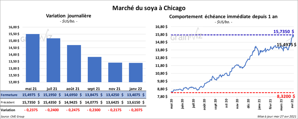Les contrats de soya US aux échéances les plus rapprochées ont fini la journée dans le rouge entre 23 et 24 ¾ cents. Ceux de tourteau de soya US aux échéances les plus rapprochées ont également terminé en baisse entre 3,30 et 5,60 $/tonne. Les contrats d’huile de soya US aux échéances les plus rapprochées ont fermé en baisse 8 points. Celui mai 21 a fait exception en clôturant en hausse de 124 points.