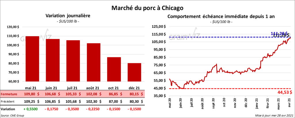 - Le 26 avril dernier, le CME Lean Hog Index était en hausse de 22 cents à 107,39 $.
