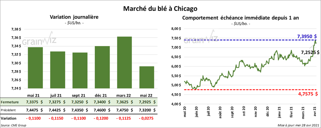À Chicago, les contrats de blé aux échéances les plus rapprochées ont fermé en baisse entre 11 et 12 cents. À Kansas, ceux de blé dur rouge aux échéances les plus rapprochées ont également clôturé avec des pertes entre 14 ½ et 15 cents. À Minneapolis, les contrats de blé de printemps aux échéances les plus rapprochées ont terminé dans le rouge entre 12 ½ et 15 ¼ cents.