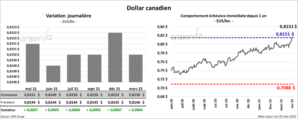Les contrats de soya US aux échéances les plus rapprochées ont fini la journée entre le neutre et une baisse de 10 ¾ cents. Ceux de tourteau de soya US aux échéances les plus rapprochées ont terminé dans le rouge entre 4,20 et 11,00 $/tonnes. À l’exception du contrat mai 21, qui a clôturé en baisse de 15 points, les contrats d’huile de soya US aux échéances les plus rapprochées ont clôturé avec des gains entre 67 et 96 points.