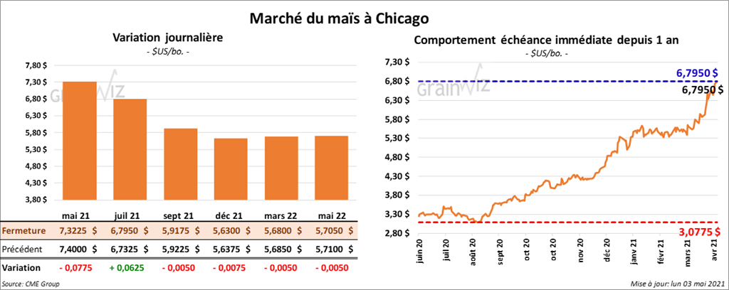 À l’exception du contrat juillet 21, qui a clôturé en hausse de 6 ¼ cents, les contrats de maïs US aux échéances les plus rapprochées ont terminé la session en baisse entre ½ et 7 ¾ cents.