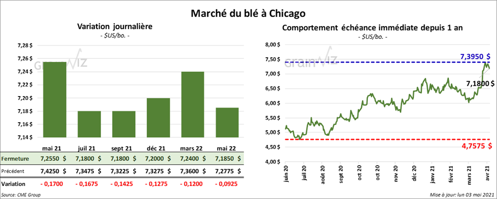 À Chicago, les contrats de blé aux échéances les plus rapprochées ont terminé la séance en baisse entre 12 ¾ et 17 cents. À Kansas, les contrats de blé dur rouge aux échéances les plus rapprochées ont également fini la journée avec des pertes entre 12 ¾ et 15 ¾ cents. À Minneapolis, ceux de blé de printemps aux échéances les plus rapprochées ont clôturé en recul entre 5 et 7 ¾ cents.