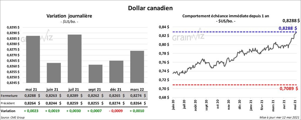 - Mondialement, l’USDA a estimé les inventaires de fin d’année de maïs 2020/21 à 283,53 millions de tonnes. Les analystes s’attendaient à une moyenne de 279,47 millions de tonnes. L’USDA a également évalué ceux de 2021/22 à 292,30 millions de tonnes alors que les anticipations de marché étaient de 283,6 millions de tonnes. En avril dernier, les inventaires mondiaux de fin d’année de maïs avaient été évalués à 283,85 millions de tonnes. De plus, l’USDA a abaissé son estimation de la récolte de maïs brésilien de 2020/21 de 109 millions de tonnes en avril dernier à 102 millions de tonnes ce mois-ci. Par contre, pour 2021/22, il s’attend à une augmentation de production à 118 millions de tonnes. Dans le cas de l’Argentine, l’USDA a laissé inchangé son estimation pour le maïs 2020/21 par rapport à avril dernier à 47 millions de tonnes. Il voit aussi une hausse de la production de maïs argentin 2021/22 à 51 millions de tonnes.