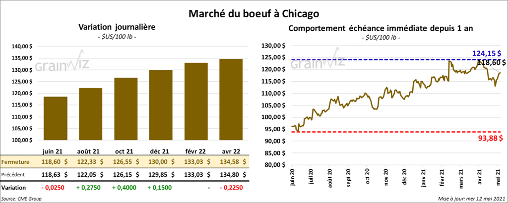 Les contrats de bœuf US aux échéances les plus rapprochées ont clôturé en hausse entre 15 et 27 cents. Toutefois, le contrat juin 21 a fait exception en terminant en baisse de 2 cents. Ceux de veau US aux échéances les plus rapprochées ont fermé avec des gains entre 1,57 et 1,80 $.