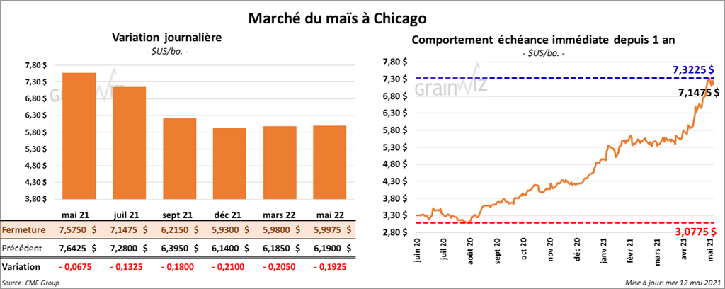 - Aujourd’hui, l’USDA publiait son rapport d’offre et de demande pour le mois de mai 21. Dans le cas du maïs US, il a estimé que les inventaires de fin d’année 2020/21 ont été de 1,257 milliard de boisseaux alors que les attentes des analystes étaient en moyenne de 1,275 milliard de boisseaux. Pour 2021/22, il a évalué les inventaires de fin d’année à 1,507 milliard de boisseaux. Les attentes des analystes étaient de 1,344 milliard de boisseaux. En avril dernier, les inventaires avaient été de 1,352 milliard de boisseaux.