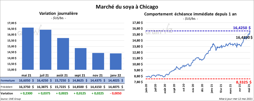 Les contrats de soya US aux échéances les plus rapprochées ont fini la journée en hausse entre ¼ et 3 ¾ cents. Ceux de tourteau de soya US aux échéances les plus rapprochées ont également clôturé avec des gains entre 1,30 et 2,30 $/tonne. Les contrats d’huile de soya US aux échéances les plus rapprochées ont fermé dans le vert entre 156 et 160 points.