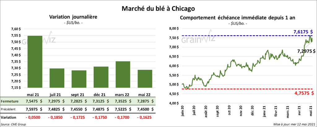 - Le rapport d’offre et de demande montre que l’USDA estime les inventaires de fin d’année de blé US 2020/21 à 872 millions de boisseaux comparativement à 846 millions de tonnes pour les attentes des marchés. En avril dernier, ils étaient de 852 millions de boisseaux. Pour 2021/22, l’USDA évalue les inventaires de blé US à 774 millions de boisseaux alors que les analystes anticipaient une moyenne de 730 millions de boisseaux. Quant à la production de tous les types de blé US, l’USDA estime celle de 2020/21 à 1,826 milliard de boisseaux, ce qui correspond à une réduction de 5,5 % par rapport à celle de 2019/20. Par contre, il projette la production de 2021/22 à 1,872 milliard de boisseaux.