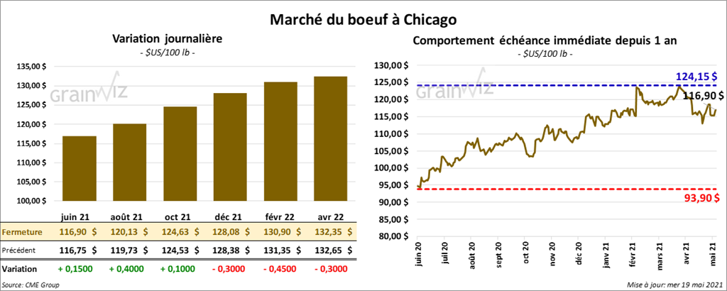 - Le 18 mai dernier, le CME Feeder Cattle Index était en hausse de 10 cents à 133,80 $.
