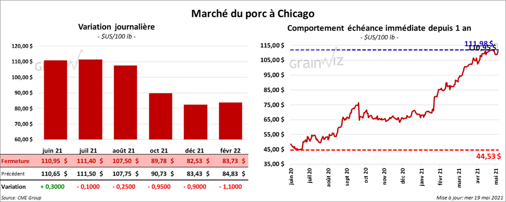 Les contrats de porc US aux échéances les plus rapprochées ont fini la session en baisse entre 10 et 90 cents. Celui juin 21 a fait exception en clôturant en hausse de 30 cents.