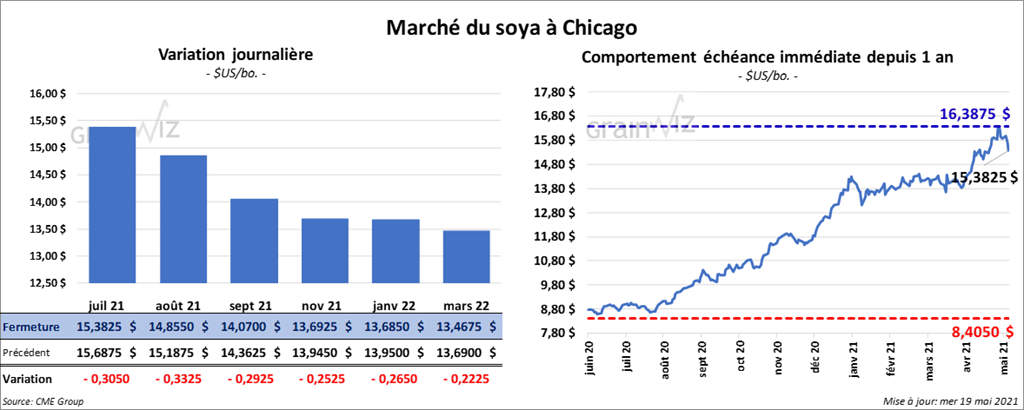 Les contrats de soya US aux échéances les plus rapprochées ont fini la session en baisse entre 25 ¼ et 30 ½ cents. Ceux de tourteau de soya US aux échéances les plus rapprochées ont également clôturé en recul entre 7 et 7,60 $/tonne. Les contrats d’huile de soya US aux échéances les plus rapprochées ont fermé dans le rouge entre 192 et 220 points.