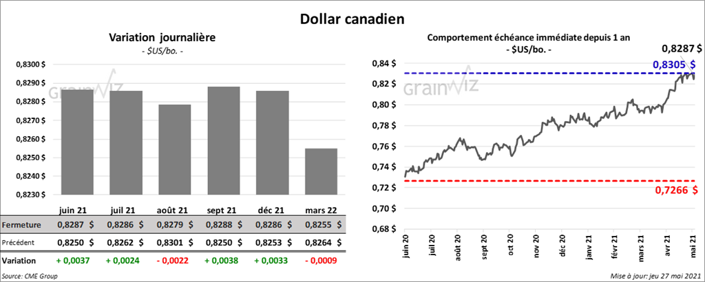 - Au cours de la semaine du 20 mai dernier, les ventes nettes à l’exportation de maïs US 2020/21 ont été de 555,900 tonnes alors que les attentes des analystes étaient entre -100,000 et 400,000 tonnes. C’était une augmentation notable comparativement à la semaine précédente comme par rapport à la moyenne des 4 dernières semaines. Le Mexique et la Chine ont été les plus gros acheteurs. Pour 2021/22, les ventes nettes à l’exportation ont été de 5,691,300 tonnes alors que les anticipations des analystes étaient entre 5,9 et 7,0 millions de tonnes. La Chine et le Panama ont été les principaux acheteurs.
