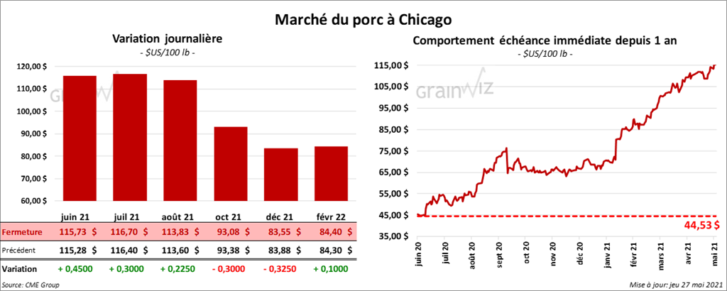 Les contrats de porc aux échéances les plus rapprochées ont clôturé dans le vert entre 22 et 45 cents. Par contre, le contrat octobre 21 a terminé en baisse de 30 cents.