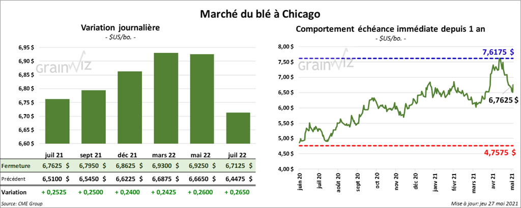 À Chicago, les contrats de blé aux échéances les plus rapprochées ont terminé la journée en hausse entre 24 et 25 ¼ cents. À Kansas, les contrats de blé dur rouge aux échéances les plus rapprochées ont fini en progression de 27 ½ cents. À Minneapolis, ceux de blé de printemps aux échéances les plus rapprochées clôturé avec des gains entre 32 et 36 ½ cents.