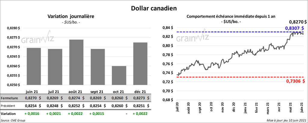 - Mondialement, l’USDA a estimé les inventaires de fin d’année de soya 2020/21 à la hausse de 1,6 % comparativement à mai dernier à 88 millions de tonnes. La moyenne des anticipations des analystes était à 86,8 millions de tonnes. Par ailleurs, l’USDA a revu son évaluation de la récolte de soya brésilien à la hausse de 1 million à 137 millions de tonnes. Il a laissé inchangée celle de la récolte de soya argentin à 47 millions de tonnes.