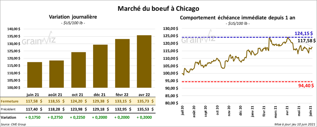 Les contrats de bœuf US aux échéances les plus rapprochées ont fini la journée en hausse entre 17 et 27 cents. Ceux de veau US aux échéances les plus rapprochées ont également clôturé avec des gains entre 12 et 30 cents.