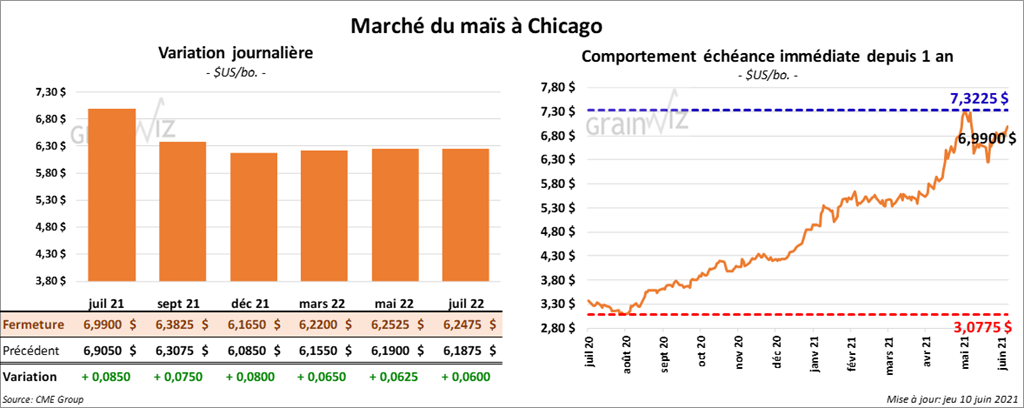 Les contrats de maïs US aux échéances les plus rapprochées ont fini la journée en hausse entre 6 ½ et 8 ½ cents.