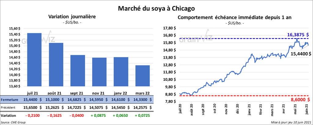 Les contrats de soya US aux échéances les plus rapprochées ont terminé la session en baisse entre 4 et 21 cents. Ceux de tourteau de soya US aux échéances les plus rapprochées ont également fermé dans le rouge entre 4,00 et 4,80 $/tonne. Les contrats d’huile de soya US aux échéances les plus rapprochées ont fini en recul entre 29 et 113 points.