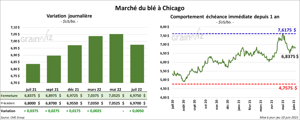 - Le rapport d’offre et de demande de juin a été présenté ce midi. Dans le cas des inventaires de fin d’année de blé US 2020/21, l’USDA estime qu’ils ont reculé de 2,3 % par rapport à mai dernier à 852 millions de boisseaux. Les attentes des marchés étaient de 869 millions de boisseaux. Quant à ceux de 2021/22, l’USDA mentionne qu’ils ont baissé de 0,5 % comparativement à mai à 770 millions de boisseaux. Les projections des analystes étaient plus élevées à 783 millions de boisseaux. À noter que l’USDA a évalué la production de blé US 2020/21 en hausse 1,4 % par rapport à mai dernier à 1,898 milliard de boisseaux.