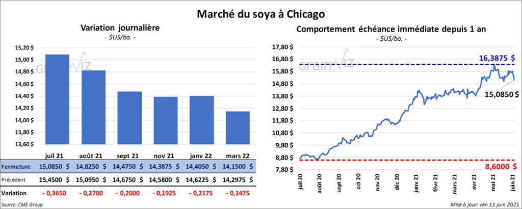 Les contrats de soya US aux échéances les plus rapprochées ont fermé en baisse entre 19 ¼ et 36 ½ cents. Ceux de tourteau de soya US aux échéances les plus rapprochées ont fait l’inverse en clôturant avec des gains entre 1,70 et 2,00 $/tonne. Les contrats d’huile de soya US ont fini en recul entre 303 et 348 points.
