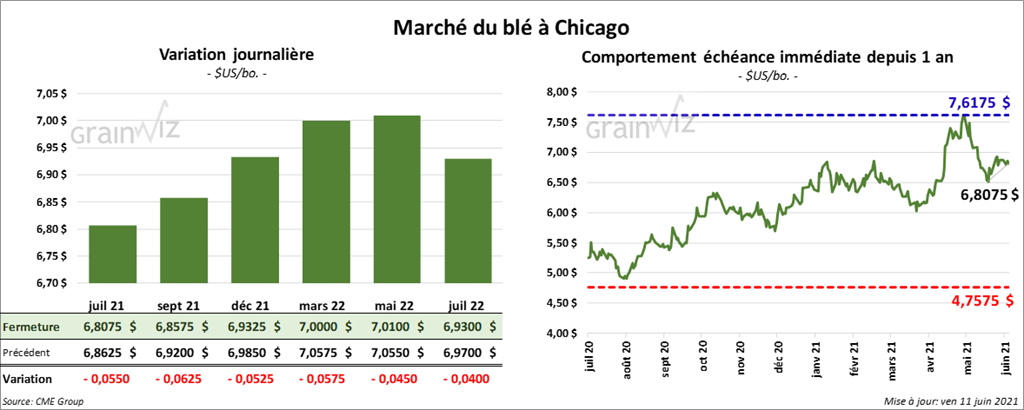 À Chicago, les contrats de blé aux échéances les plus rapprochées ont clôturé dans le rouge entre 5 ¼ et 6 ¼ cents. À Kansas, les contrats de blé dur rouge ont également terminé avec des pertes entre 2 ¼ et 2 ¾ cents. À Minneapolis, ceux de blé de printemps aux échéances les plus rapprochées ont fini en baisse entre 7 et 10 ¾ cents.