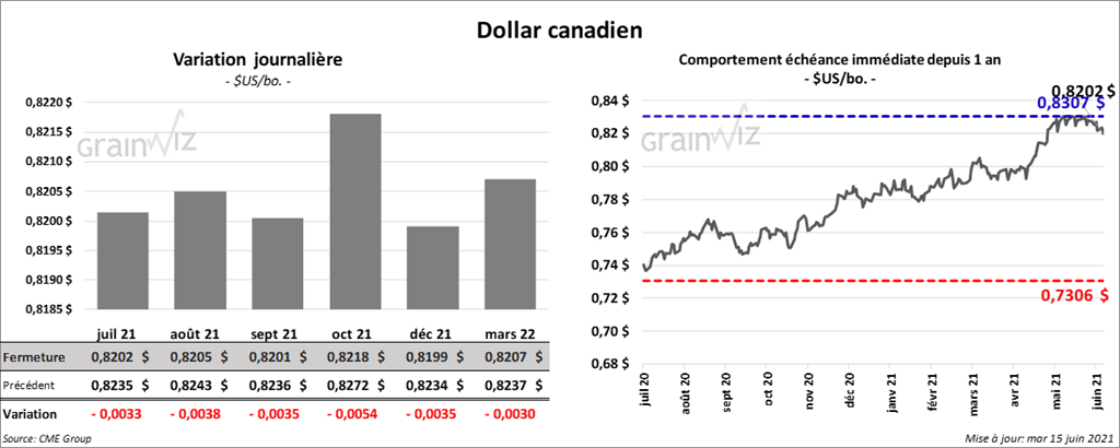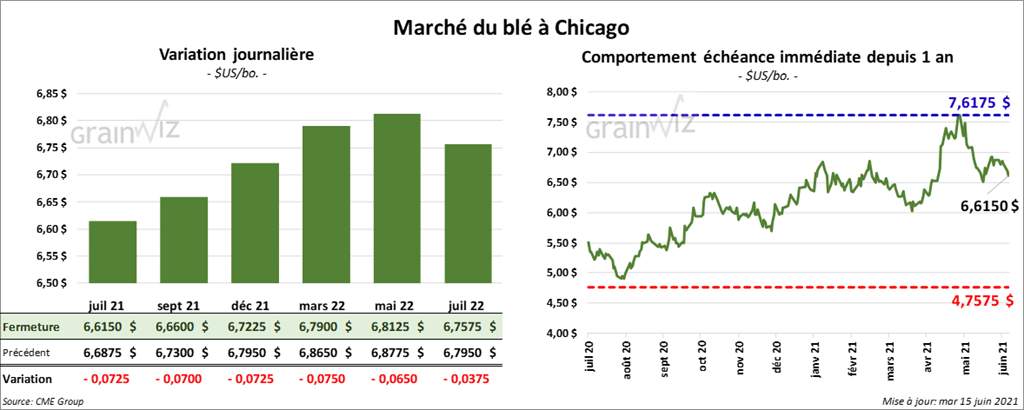 À Chicago, les contrats de blé aux échéances les plus rapprochées ont fini la journée avec des pertes entre 7 et 7 ½ cents. À Kansas, ceux de blé dur rouge aux échéances les plus rapprochées ont clôturé en baisse entre 14 ¾ et 15 ¼ cents. À Minneapolis, les contrats de blé de printemps aux échéances les plus rapprochées ont fait l’inverse en terminant en hausse entre ½ et 1 ¼ cent.