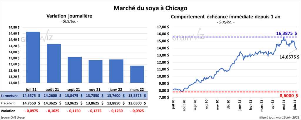 Les contrats de soya US aux échéances les plus rapprochées ont fermé en baisse entre 9 ¾ et 12 ¾ cents. Ceux de tourteau de soya US aux échéances les plus rapprochées ont clôturé avec des pertes entre 1,50 et 5,70 $/tonne. les contrats d’huile de soya US aux échéances les plus rapprochées ont aussi terminé la session dans le rouge entre 39 et 59 points.